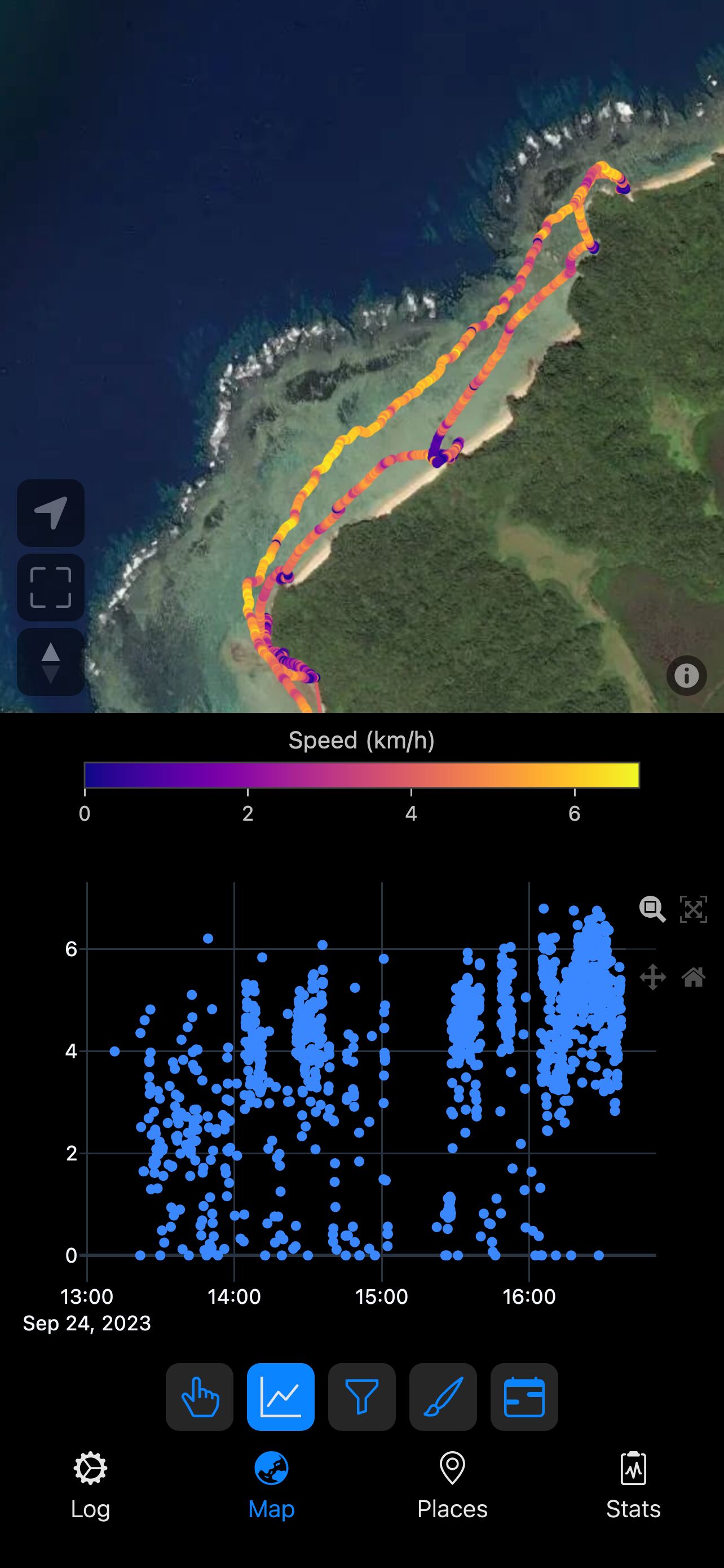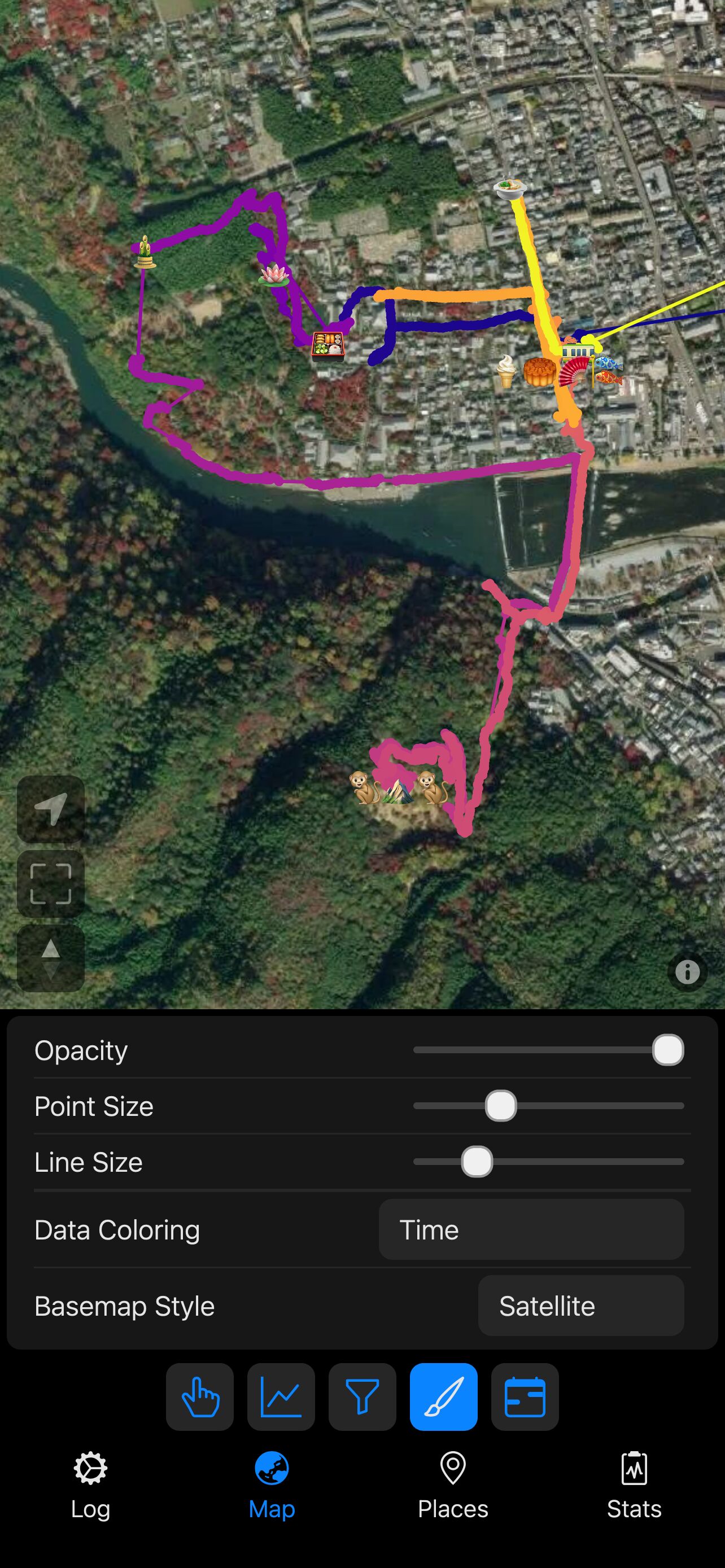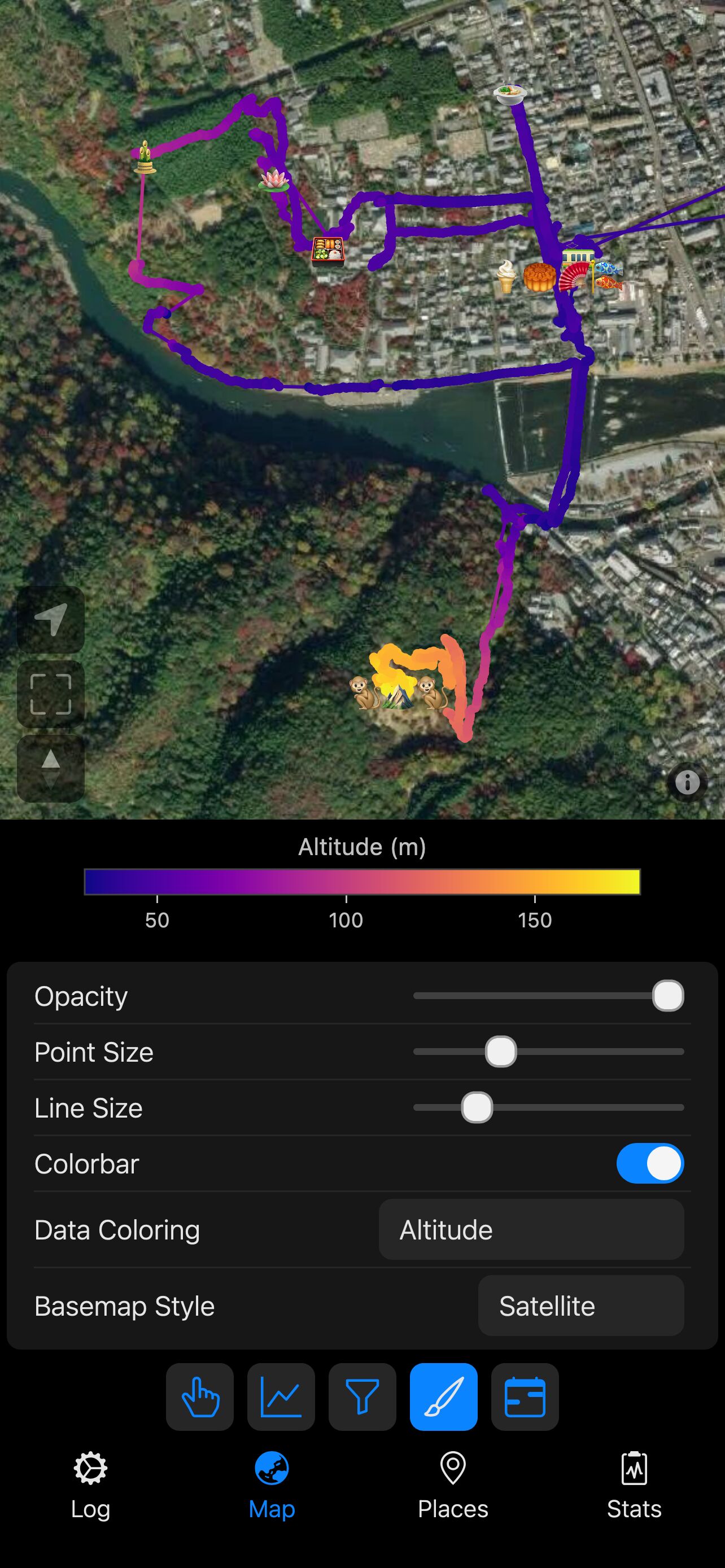 - Data colormapping for speed, course, accuracy, time, altitude, etc.